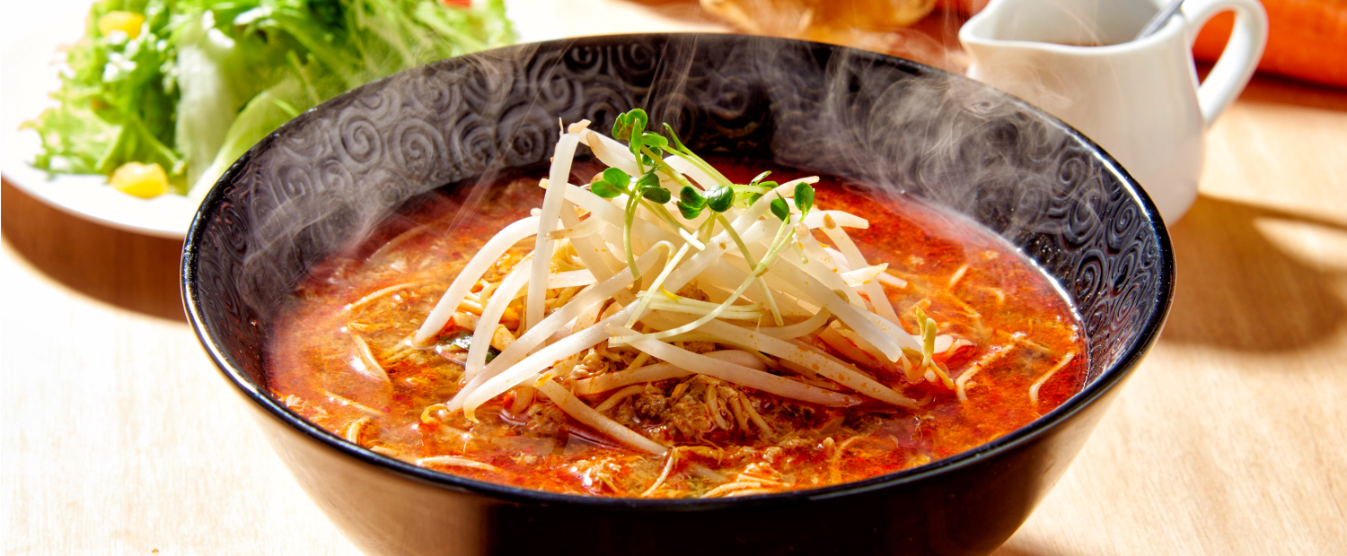 唐辛子やニンニク、ニラなどの健康食材をふんだんに使い、特別に挽いた合い挽き肉と秘伝のスープを加えたヘルシーなスープで包み込んだ辛麺は絶品!※価格はすべて税抜
